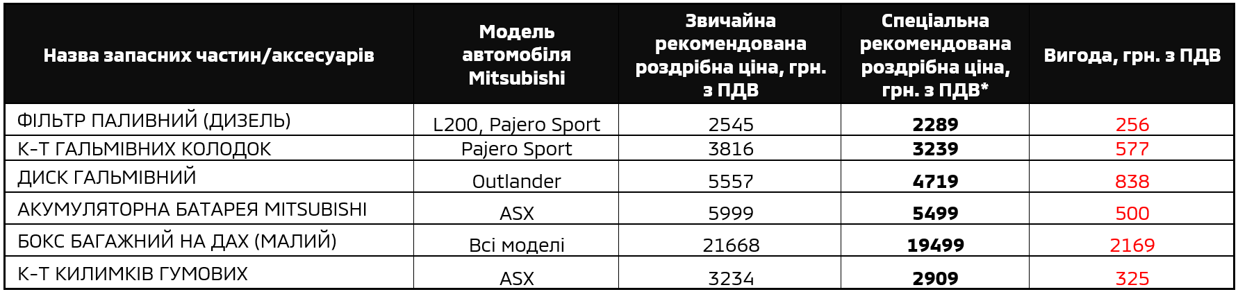 * Мається на увазі встановлення спеціальних цін на обмежений асортимент запасних частин і технічних рідин до автомобілів ТМ «Mitsubishi» (акційні товари). Пропозиція діє з 01.12.2025 р. до 28.02.2026 р. включно у мережі офіційних дилерів Mitsubishi Motors в Україні (крім тимчасово окупованих територій). Деталі співвідношення розміру вигоди до попередньої ціни реалізації, перелік акційних товарів та інші умови дізнайтесь на сайті mitsubishi-motors.com.ua та у консультантів дилерів.